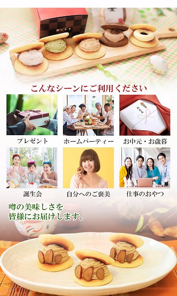 成分表示 | 【栗モンブラン】栗ペースト(国内製造)、渋皮栗甘露煮、生クリーム、乳等を主要原料とする食品、卵、小麦粉、砂糖、小豆、粉末油脂、蜂蜜、水飴、洋酒、還元麦芽糖水飴、味醂、醤油、寒天/トレハロース、膨張剤、クロレラエキス、香料(一部に卵・小麦・大豆・乳成分を含む) |